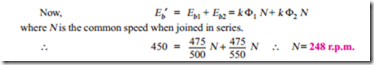 Example 30.44. Two series motors run at a speed of 500 r.p.m. and 550 r.p.m. respectively when taking 50 A at 500 V. The terminal resistance of each motor is 0.5 W. Calculate the speed of the combination when connected in series and coupled mechanically. The combination is taking 50 A on 500 V supply. (Electrical Machinery-I, Mysore Univ. 1985)