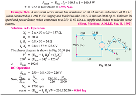 Example 36.4. A 250-W, single-phase, 50-Hz, 220-V universal motor runs at 2000 rpm and takes 1.0 A when supplied from a 220-V dc. supply. If the motor is connected to 220-V ac supply and takes 1.0 A (r.m.s), calculate the speed, torque and power factor. Assume Ra = 20 W and La = 0.4 H.